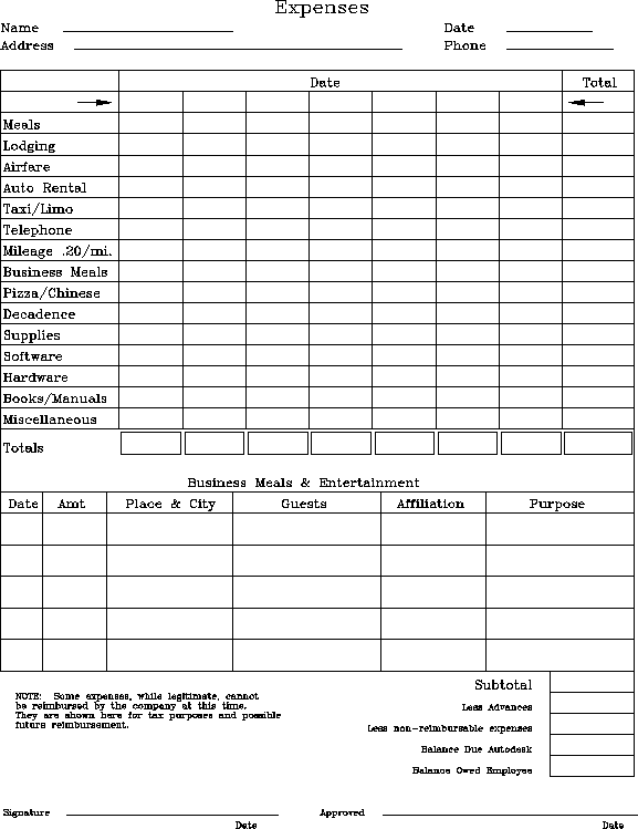 This was Autodesk's first expense report form, with items befitting the proclivities of the founders. This copy was painfully reconstructed from a paper copy of the form by Duff Kurland.