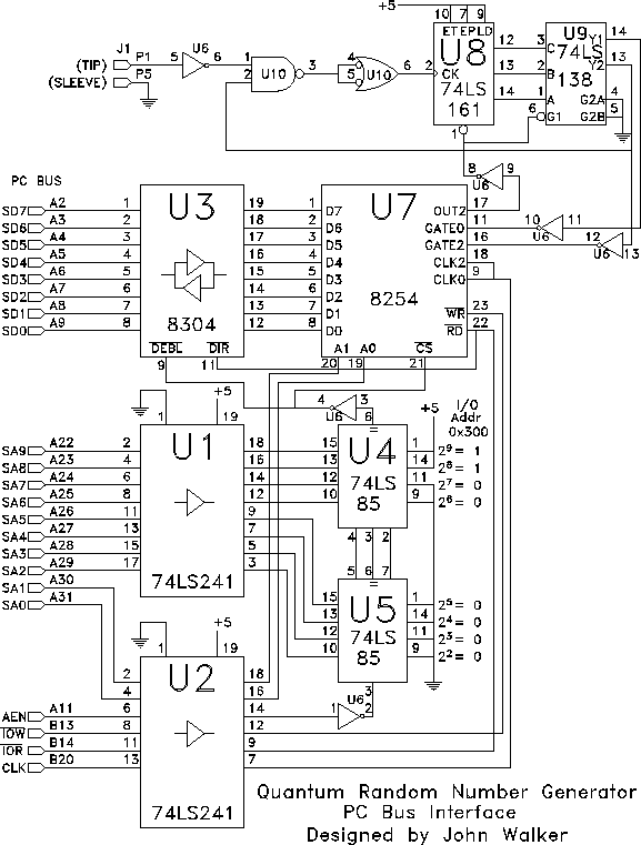 Even though Autodesk taught me that selling software works much better than selling hardware, I've learned that success with software doesn't assuage the compulsion to build a gizmo every now and then. In 1986 I built this card that plugs into the IBM PC bus and attaches to a trivially-modified Heathkit RM-4 Geiger tube radiation monitor. I use a 10 microCurie Cesium 137 source to generate radioactive decay events. Along with a little software, this generates true random numbers, as opposed to computer-generated pseudorandom numbers. I drew the schematics using a development version of AutoCAD Release 9 in an attempt to find AutoCAD bugs. I didn't find a one.