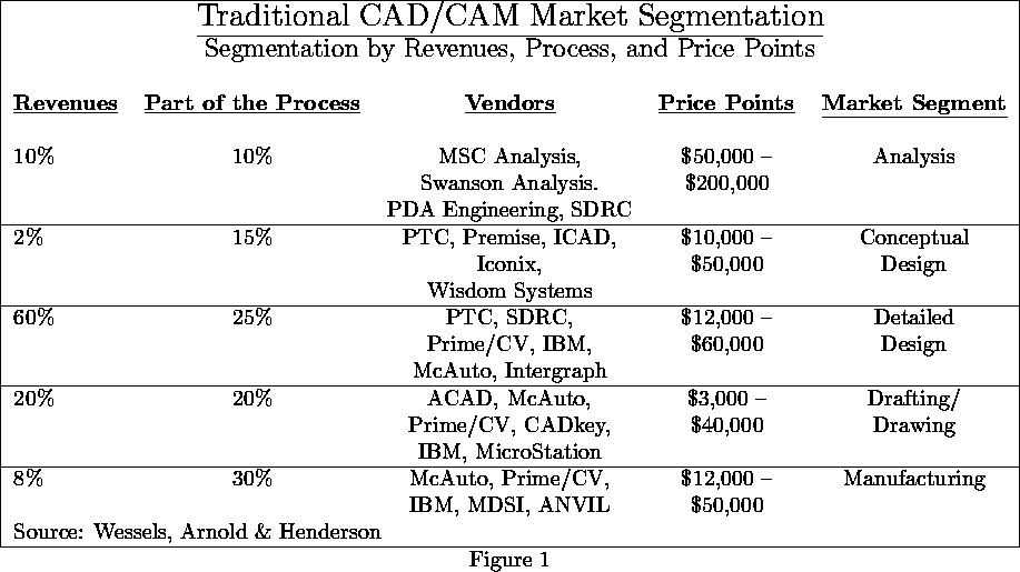 Figure 1 is a representation of the traditional CAD/CAM/CAE market. As one can see, it covers almost every aspect of the design/manufacturing process as we defined it previously. By the estimation of Wessels, Arnold & Henderson, an institutional research company, the mechanical CAD/CAM market ``numbers over 2 million users worldwide and provides a total software revenue potential of $10-$20 billion at a 50% saturation expectation. We estimate the current penetration of the mechanical CAD audience is still less than 20%. More importantly, early users of CAD/CAM systems, using systems based initially on mainframes and minicomputers and later on desktop engineering workstations, are ready for a new level of design capability.''