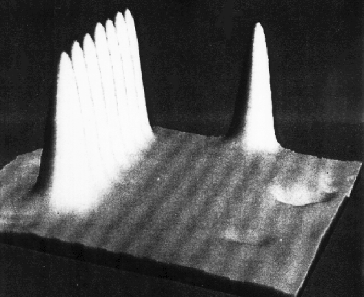 Here's a picture of xenon atoms on a nickel crystal, lined up in a row by pushing them into place with an STM tip. Remember, those bumps are individual atoms, and they've been moved precisely into position, in a row, one half nanometre from each other.
