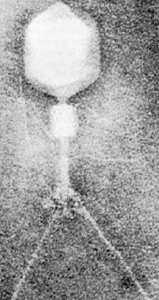 Here's an electron micrograph of some E. coli cells infected with another virus, phage f2. The crystalline lattice in the corner of the cell is an array of self-assembled copies of the virus, manufactured within the cell.