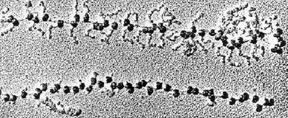 Here's a picture of a molecular-level file copy operation in progress. This is a 140,000 times blow-up of a strand of messenger RNA being transcribed into the proteins it encodes by a bunch of ribosomes--they're the little beads on the string of RNA. The bumpy strings coming out the sides are the protein chains being assembled by the ribosomes. Each ribosome is a little molecular machine about 20 nanometres across that manufactures proteins to order by reading a tape called messenger RNA and assembling the protein it describes according to the genetic code.