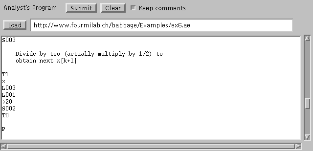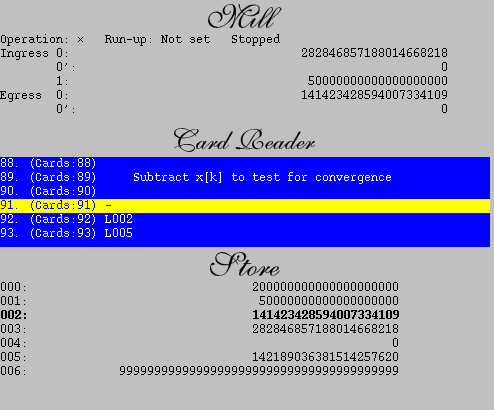 The topmost section of the window shows the current state of the Mill, with the first line indicating the current arithmetic operation, whether the run up lever is set, and whether the Engine is running (processing cards automatically) or halted, either for manual operation or due to an error or reaching the end of a card chain. The lines that follow show the values currently in the input and output axes of the Mill. Note that since loading the second argument of an arithmetic operator causes the Mill to perform the calculation, as soon as a value is loaded into Ingress axis 1, the results will appear in the Egress Axis and, if a multiplication or division, in the Primed Egress Axis.