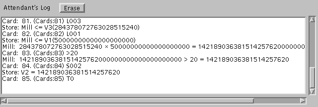 The Attendant's Log shows messages from the Attendant to the analyst. If an error is found in a chain of cards submitted from the Analyst's Program panel, it will be reported here. If a trace of the computation is requested, the attendant writes the trace information here. To clear the Attendant's Log panel, press the “Erase” button.