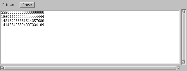 The Printer panel shows all items written on the Printing Apparatus by “P” cards, as modified and expanded by various Attendant Request cards pertaining to the presentation of numbers and addition of annotations to the results. The Printer panel appends results from successive runs of the Engine to a continuous scroll; to clear the scroll, press “Erase”.