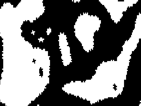 You can run this rule by inputing the RuleNum 992 to RC's Vote, or you can run it in JC by loading t(992) as explained below. Run it on a random start screen a few times. What do you see? You see a pattern that evolves through a few dozen steps and then freezes up at some rigidly gerrymandered division of black and white.