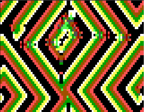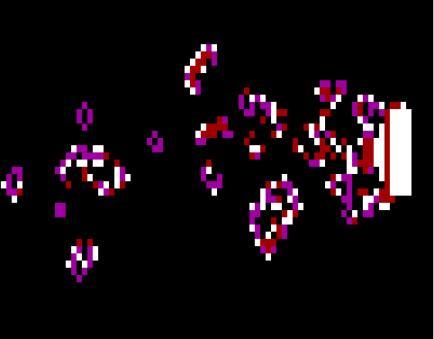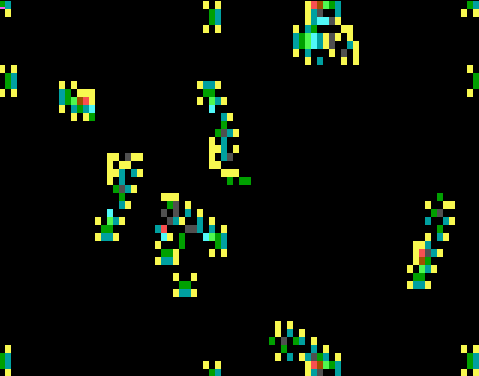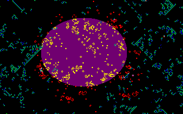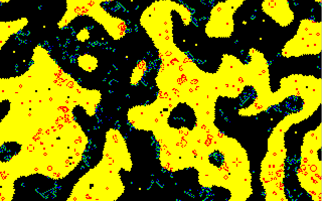 Ranch works best if the starting configuration is such that the Vote rule establishes two horizontal (or vertical) stripes of yellow land as well as a black on either side of a stripe of water. Since the screen is treated as a torus, if a stripe can wrap around it is safe from shrinking to nothing. The persistence of live Brain cells traveling along the black region is particularly well promoted by the presence the small manshaped Vote oscillator I call robotman. Under Vote, robotman spins about his horizontal axis like an acrobat. Every time a Brain glider hits robotman, he gets infected with red Life cells which burst back out of him to produce showers of new live Brain cells. He's good to lay eggs on. You can use the JC screen editor to draw a robotman in the Ranch sea.