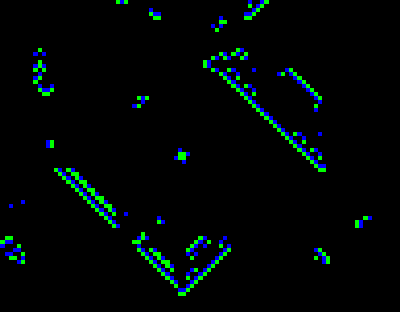 You might try making a copy of Vote.PAS and editing it to get a rule which remembers the last 7 values of each cell. The "inland" cells in the middle of the "on" regions stabilize at the color 11111111b=256d (which happens to be red in the default palette). The "at sea" cells in the middle of the "off" regions stabilize at the color 00000000b (black). But the border cells range through a spectrum of 256 possible colors that depend on how the elections have been running in their neighborhood. If you press Alt-F9 and tell the prompt you want to change the color of state 255 to 0 (CGA) or to 0, 0, 0 (VGA), then VoteMem will have the appearance of lovely colored strings.