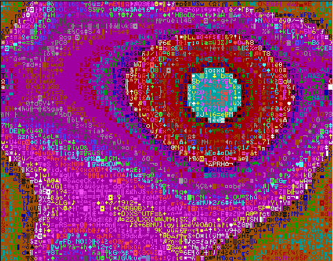 The basic idea of ASCII is that each cell keeps being set to the average state value of its neighbors. In ASCII each state is specified by sixteen bits which are displayed as a color and as an ASCII character. The order from most to least significant bits is 1) the four IRGB bits of background color, 2) four IRGB bits of foreground color, and 3) eight bits of ASCII code number. (Recall that IRGB is "intensity, red, green, blue.")