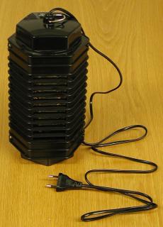 These are not elegant devices, but they get the job done. The principle couldn't be simpler—flying insects, whose compound eyes see long-wave ultraviolet light that mammalian eyes don't, are attracted by the lure tube, which appears to emit a dim blue light to humans. To reach the light, they have to fly between wires electrified with between 4 and 8 kilovolts which, when the insect completes the circuit, kill-a-bug.