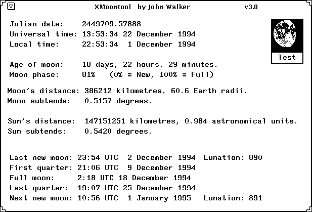 I have long been fascinated by computational celestial mechanics, as it provides a link between the world inside the computer and the real world observable in the night sky. In 1988, I rewrote my earlier Moontool for Sun workstations to run on the Commodore 128, whose BASIC 7.0 provided the features needed for the program.