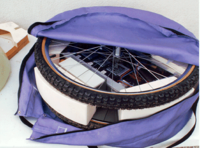 For transport, the wheels are removed and attached to the sides of the main chassis. All components can be packed into a special rucksack.