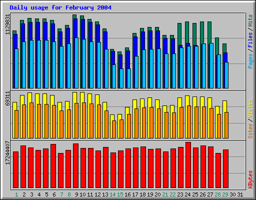 After these investigations and revelations, I mostly ran out of ideas apart from monitoring the statistics on a daily basis. Given that the Mydoom worm had a self-destruct date of February 12th, I was intensely interested to see what would happen to the hits on my site as that date approached. The hits started here first; would they also end before the 12th? Well, no, but on Friday the Thirteenth of February 2004, the attack began to deflate along a trajectory almost symmetric to the initial ramp-up, and has continued to do so subsequently. The end appears to be at hand. Still, one must temper one's optimism; recall that the other site hit by an almost identical attack saw pauses, then resumption of the assault. In any case, with the attack having ended or at the very least going on hiatus, there's nothing to do other than keep an eye on the logs to see if it comes back. The daily usage chart for February shows the abrupt drop in hit rate as the attack ended, then resumed on the 17th. Entries for the last week of February are perturbed by the introduction of countermeasures against the attack.