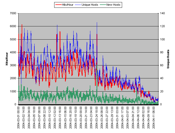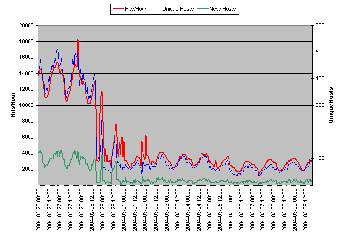 Starting at 2004-02-13 11:00 local time (which, interestingly enough, is 12:00 UTC, and hence midnight of the 14th at the International Date Line), hits per hour and unique hosts hitting the site began to rapidly fall and have continued to drop monotonically ever since. Further, new hosts (attacks from IP addresses never seen in earlier attacks) dropped from 104 in the 12:00 local time bin to 34 in the 13:00 time bin, then 23 and 16 in the next two hours. Since then the number has continued to fall, although not monotonically, to a mean of around 10 in the last few hours. All of these are levels not seen since the attack began spooling up in earnest on 2004-01-25. The chart shows how dramatic this abatement has been.