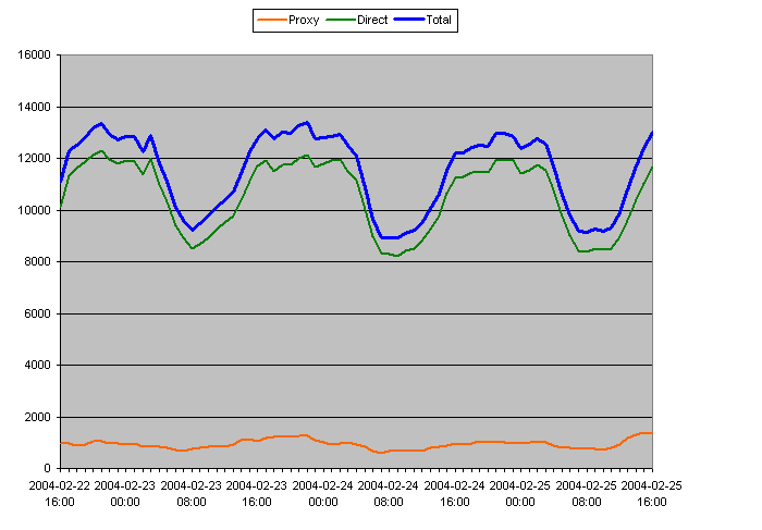 Today saw a new recent high for the second wave of the attack, with the divergence between hits per hour and unique IP addresses still in evidence. I wrote a program to analyse the contribution of hosts hitting directly compared to those hitting through HTTP proxy servers and produced a chart showing proxy and direct hits and the sum. (The chart begins on 2004-02-22 because that's when I started collecting data which permits distinguishing proxy and direct hits.) As a glance at the chart will reveal, there's been no secular change since that date in the mix of proxy and direct hits, so that cannot explain the divergence of hit rate and unique IPs seen recently. Further, it's clear that although proxies occupy the top slots in the heavy hitters table, they account for a small fraction of the total hits, most of which come from individual machines hitting directly. This is useful information, as one of the active measures I'm thinking about deploying will not work on hosts connected through a proxy. With the total contribution of proxies so small, proceeding with anything which might reduce hits, even if only from directly connecting hosts, is justified. The program used to produce the proxy and direct hit chart has been added to the analysis tools download at the bottom of the page. Note, however, that it requires an HTTP server configured to write a special "forensic log", not one of the standard log formats. Instructions for configuring the Apache HTTP server (version 2) to write such a log are included in the program, proxymix.pl.