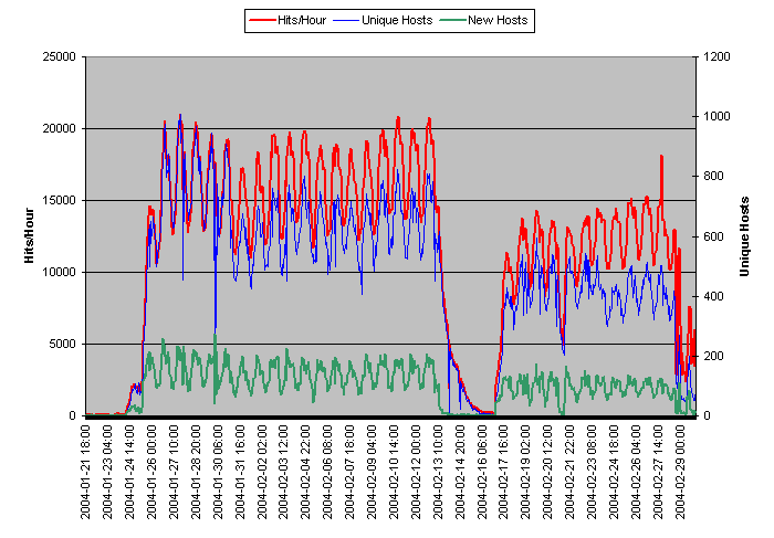 Still occupied trying to push a particularly recalcitrant project out the door, I've done nothing other than update the chart and reports. Today's high was back at the 20,000 hits per hour high seen last week, so there's no sign of abatement. To avoid hitting the 2 Gb wall, I had to cycle the HTTP log file tonight, so starting tomorrow the reports will be split into a 2004-01-21 to 2004-02-09 historical report and an ongoing report starting at 2004-02-10.