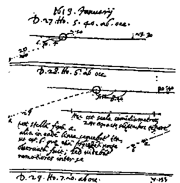 Christmas day, Crane and I had been invited to Hack Watkins' for turkey dinner. Later, as we watched Watkins' kids reduce their holiday bounty to pieces siftable through chicken wire, Art was holding forth on his latest idea—second-hand SETI. He was fascinated by pre-discovery observations. Galileo spotted Neptune and even charted it next to Jupiter in one of his notebooks. If the next night hadn't been cloudy, he'd probably have discovered it more than 200 years before Adams and Le Verrier.
