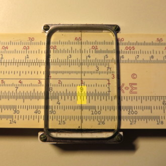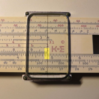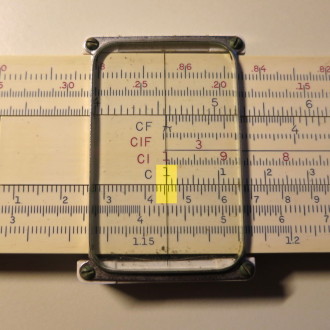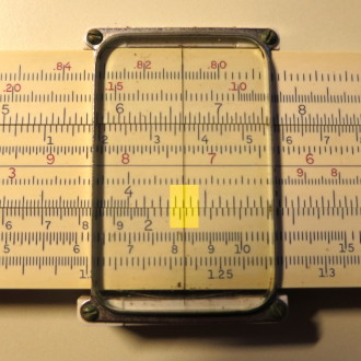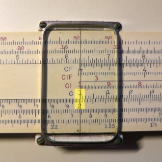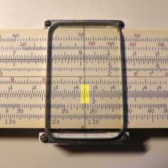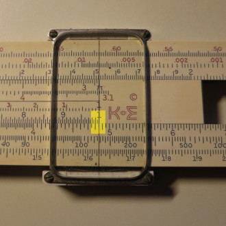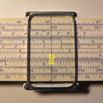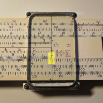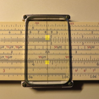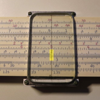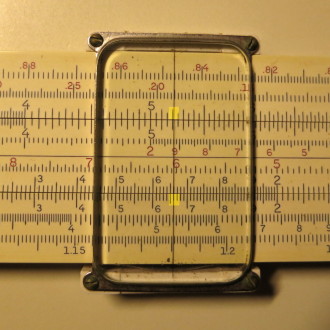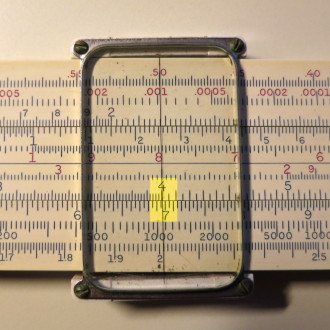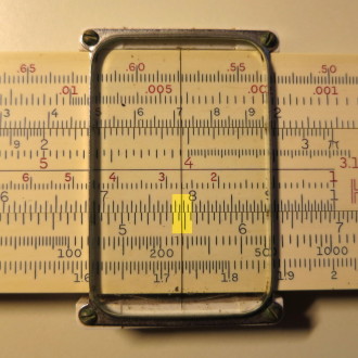 You whip out your slide rule. You move the cursor to 3.5 on the D scale (recall that the slide rule knows nothing of decimal points; that's up to you). You align the start (1 mark) of the C scale on the slide with the cursor.