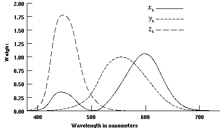 The CIE colour matching functions (Figure 1) x̅λ, x̅λ, and z̅λ give the relative contributions of light with wavelength λ to the CIE tristimulus values X, Y, and Z. The colour matching functions were determined by measuring the mean colour perception of a sample of human observers over the visual range from λviolet=380 to λred=780 nm. To calculate CIE X, Y, and Z values for light with spectrum P(λ) we sum, over the visual range, the products of the colour matching function weights at each wavelength and the intensity emitted at a constant narrow wavelength interval centred there: