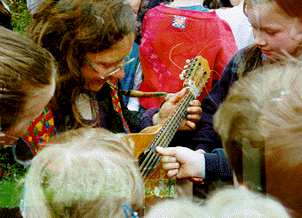Inge (Belgium) demomstrates her mandolin to a group of Abbeyleix schoolgirls.