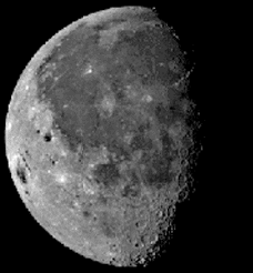 At left, the Moon image returned by Galileo is shown, while the image at right is a Moon Viewer-generated view of the same hemisphere. Other than darkroom judgement calls about brightness and contrast, the images are strikingly similar. It's when the Moon is not fully illuminated (and hence the terminator is visible) that the shortcomings of a pure albedo map become apparent, as the following comparison between another view of the Moon from Galileo and Moon Viewer's rendering of the same viewpoint and illumination.