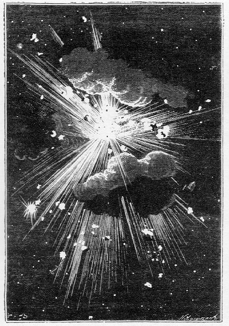 Deux minutes après la brusque apparition du bolide, deux siècles d'angoisses ! le projectile semblait prêt à le heurter, quand le globe de feu éclata comme une bombe, mais sans faire aucun bruit au milieu de ce vide où le son, qui n'est qu'une agitation des couches d'air, ne pouvait se produire.