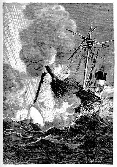 Cette masse ignée grandit à leurs regards, s'abattit avec le bruit du tonnerre sur le beaupré de la corvette qu'elle brisa au ras de l'étrave, et s'abîma dans les flots avec une assourdissante rumeur !