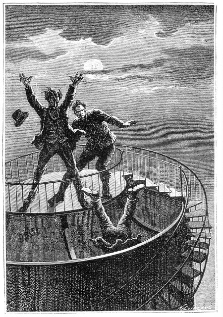 Il se tourna vers J.-T. Maston. L'infortuné, imprudemment penché sur le tube de métal, avait disparu dans l'immense télescope ! Une chute de deux cent quatre-vingts pieds ! Belfast, éperdu, se précipita vers l'orifice du réflecteur.
