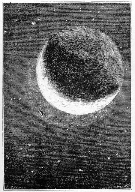 Le disque lunaire brillait alors avec une incomparable pureté. Ses rayons, que ne tamisait plus la vaporeuse atmosphère du globe terrestre, filtraient à travers la vitre et saturaient l'air intérieur du projectile de reflets argentins. Le noir rideau du firmament doublait véritablement l'éclat de la Lune, qui, dans ce vide de l'éther impropre à la diffusion, n'éclipsait pas les étoiles voisines. Le ciel, ainsi vu, présentait un aspect tout nouveau que l'oeil humain ne pouvait soupçonner.
