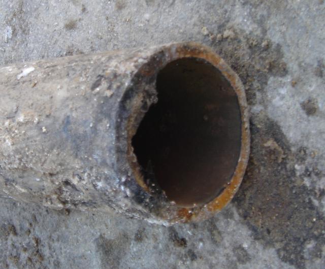cut-off saw--as soon the first end was cut, the segment of pipe fell apart at the break. At the left are both pieces of the removed pipe, showing the break on the shorter end. Clearly, from the rust around most of the fracture, the failure occurred over an extended period, starting as a slow leak from a hairline fracture and only failing catastrophically a few days ago.