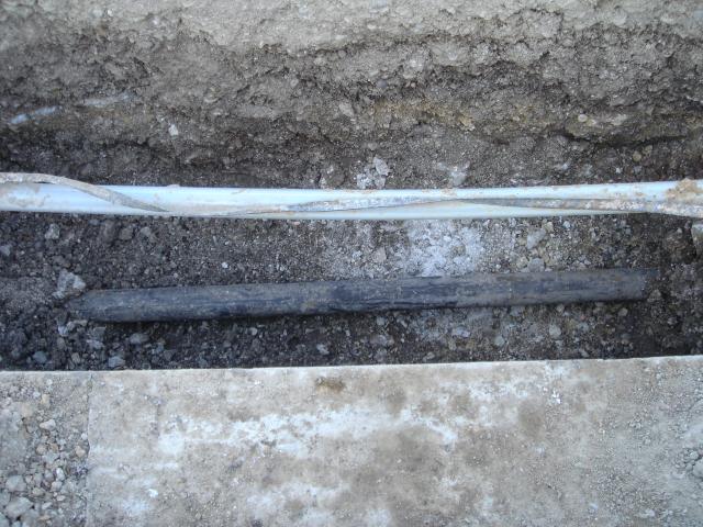 Having located the leak (or, as my entropic storm-tossed brain persisted in deeming it, "the first leak"), Thursday morning was spent expanding the hole around the leak both downward below the one metre depth where the water pipe ran (to avoid freezing--did I mention that this fun-fest was conducted in temperatures of -10°C?) to make room for the splice sleeve, and along the run of the pipe to have enough room for the splice and to ensure we'd removed all of the failed section. The picture at the left shows the failed pipe after it had been fully excavated. The failure isn't obvious in this picture (click on the image for an enlargement), but it's about one quarter of the way from the right of the trench. The grey tube above the black water pipe is the conduit in which the telephone lines run into Fourmilab; above it is a solid metal ground conductor to protect the phone lines from lightning strikes.