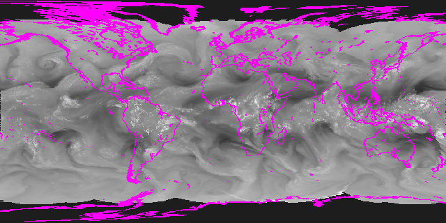 This isn't exactly news, as most of the the links I mention in this message have existed for years (the water vapour image links are new, however), but previously I've only furnished this information on demand to those who write to request it. This posting not only makes the information generally available, but can be cited in response to future queries, avoiding the need to dig up the information from scratch each time.Earth and Moon Viewer provides access to current weather satellite imagery made available by the Space Science and Engineering Center of the University of Wisconsin. These images are transformed from the Mollweide projection in which they are published into a cylindrical projection suitable for mapping onto a sphere. In addition to the change in projection, the images are contrast stretched and composited with a cartoon background of sea and land.