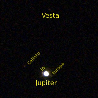 After two days of utterly foul weather, I was blessed with clear skies for the night of the closest approach of asteroid 4 Vesta to Jupiter. The picture at the right, taken around 22:15 local time (20:15 UTC) on 2007-08-30 shows Vesta at the top, with Jupiter and its moons Callisto, Io, and Europa at the bottom.