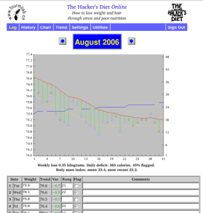 You don't need a computer to use The Hacker's Diet; easy-to-work paper and pencil methods are presented in the book. But if you have a computer with Web access or Excel, or a PalmPilot, the companion tools may save you time and provide more insight into the engineering underpinning of the methods described in the book, while producing an illustrated log of your progress.