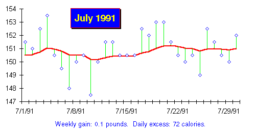Decide for yourself how closely you want to track the slope of the trend and balance your calories. You can view it as a kind of game, worth playing well in pursuit of a perfectly flat trend line. On the other hand, the whole idea of adding ten calories one month and subtracting fifteen the next may seem a particularly horrid example of obsessive compulsive behaviour. No matter, what's really important is what you do when the trend line wanders outside the 5 pound band centred around your weight goal. If your goal is 150 pounds, the band limits are 147.5 and 152.5. Whenever the trend line ends a month outside this range, action to correct the divergence is triggered. In the chart above, the rapid rise left the trend right at 152.5 at month's end. If the rise were not halted by reducing calories based on the slope of the trend, by next month the trend would have climbed well above 152.5, requiring a mandatory cutback to restore the trend to below that mark.