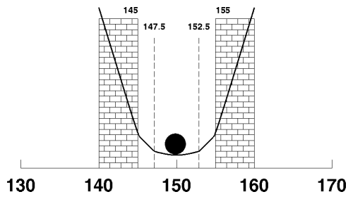 By using the trend to adjust food intake, we have implemented a very different feedback system. As weight varies within the 5 pound band around the goal, 150 pounds here, it is subject to only a minor degree of feedback, applied by monthly adjustments to what you eat based on the slope of the trend line. If you choose not to bother with such small adjustments, the floor of the feedback curve from 147.5 to 152.5 pounds will be flat and your weight completely free to vary within that band.