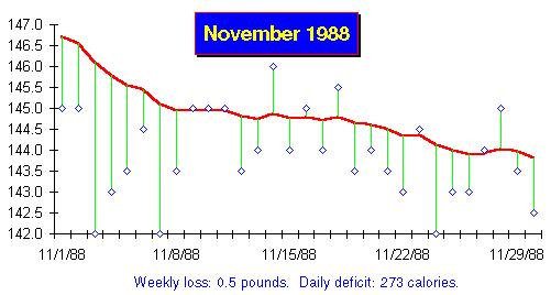 Here's a chart of the transition to stability at the end of my diet in 1988. I began the transition at the end of the first week of November and added calories at a steady rate, week by week, throughout the month. You can see how the trend line, which had been declining 1.7 pounds per week over the entire diet, halted its fall, leveled out, and declined only slightly over the rest of the November. Since I intended to take my weight two or three pounds below my goal of 145 as a safety margin, the gradual decline during the first three weeks of the transition didn't concern me.