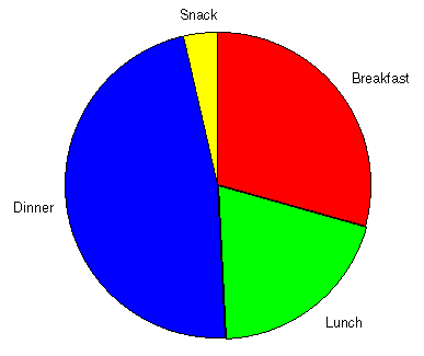 When you're trying to adjust a meal to a given number of calories, it's useful to see which components of the meal account for most of the calories. Choosing MEAL CHART CALORIES generates a pie chart showing the relative calorie contribution of each item comprising the current meal.