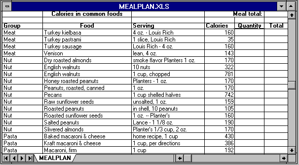 Rather than do lots of arithmetic and flipping through calorie tables, you can use the MEALPLAN.XLS worksheet and Excel to expedite the selection of foods. When you load the worksheet, you'll see a screen like this: