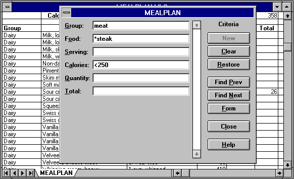 Scrolling back and forth through a huge list of foods isn't much of an improvement over a printed table. Excel's DATA FORM facility, however, lets you retrieve foods from the database based on a wide variety of selection criteria.