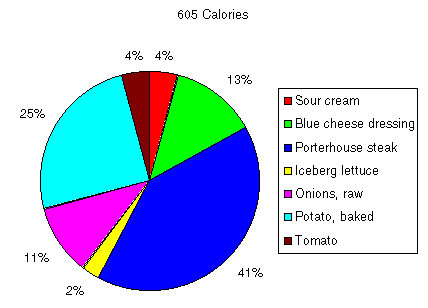 The pie chart often points out aspects of a menu that don't jump out as obviously from a table of numbers. Doris might be startled to discover just how many of the calories in her dinner came from that single one tablespoon dollop of blue cheese salad dressing. The pie chart fingers it as the third largest calorie item, accounting for more than 12% of the entire calories in the meal. Given this information Doris might, for example, switch to a low-fat dressing that contains only 3 calories per tablespoon. It might not taste as lush and creamy, but the calories saved would allow her to add, for example, an ear of corn on the cob and still wind up with fewer calories.
