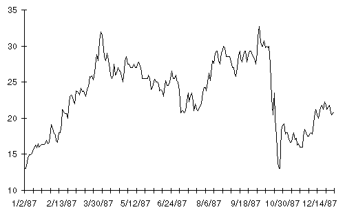 Here's the kind of raw data a stock trader looks at. This is a chart of the daily closing price of the stock of Autodesk, Inc., the company I founded, in the eventful year of 1987. That year saw Autodesk hit all-time highs, get clobbered by the Crash of '87, then begin a slow recovery as the year ended (which eventually carried it to a high of $60/share in 1990).