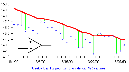 From what we've learned already, this month is easy to interpret. It's a month of rapid weight loss proceeding at a steady pace. As we've seen before, the trend chart can be used to calculate the average daily calorie deficit for the month it represents. That indicates the extent of the excess or shortfall of calories entering the rubber bag that month.