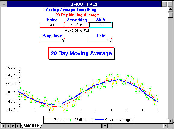 Depending on your monitor and graphics board, you may have to resize the window to see the entire worksheet. The chart shows the true trend line as a thin red line. This trend is masked by random variations from day to day, resulting in daily measurements drawn as green diamonds connected by yellow lines. The trend extracted by the selected moving average is drawn as a thick blue line. The closer the blue line approximates the red line indicating the true trend, the more effective the moving average has been in filtering out the short term random variations in the measurements.