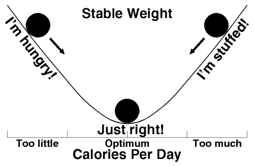 When Sam eats the same number of calories as he burns, the ball rests at the bottom of the bowl and his appetite is silent. If less food goes in than he burns, whether from skipping meals, eating less at each meal, or from the extra calories he burns up practicing wolverine juggling three times a week, the ball drifts to the left. As it does, his appetite begins to signal, subtly at first then with increasing stridency, the need for more food. Conversely, when too many working lunches become rounds of ``eat fast or get the anchovies''; when Sunday afternoon touch football in the back yard is supplanted by Monday Night Football in front of the illuminatus, too many calories begin to push the ball to the right. ``How can you think of food?'', groans Sam. ``You guys enjoy your burgers. All I want is a stalk of celery and a good night's sleep!''