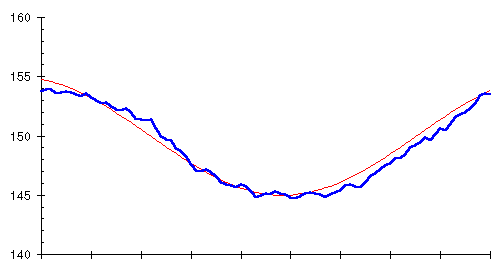 Bingo! Averaging the last ten days and plotting the average every day (the heavy blue line) closely follows the trend of actual weight (the thin red line). What we've just computed is called a 10 day moving average, ``moving'' because the average can be thought of as sliding along the curve of raw weight measurements, averaging the last 10 every day.