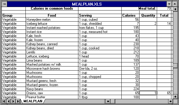 Note that a new MEAL menu has appeared at the right of the menu bar, after the standard Excel menus. To clear any previous meal, select MEAL CLEAR MEAL. The ``Meal total'' in the upper right of the screen will be blank, indicating no foods are selected for the current meal. You include foods in a meal simply by scrolling the display to the desired food (they are organised by food groups such as ``Fish,'' ``Dairy,'' and ``Vegetable'' in alphabetical order, then alphabetically within a group by the name of the food), then entering the quantity of food you intend to eat, in terms of the given ``Serving'' size, in the ``Quantity'' cell. The ``Calories'' column gives the number of calories per serving of each food so you can easily see the consequences of including a given food in your meal.