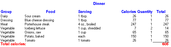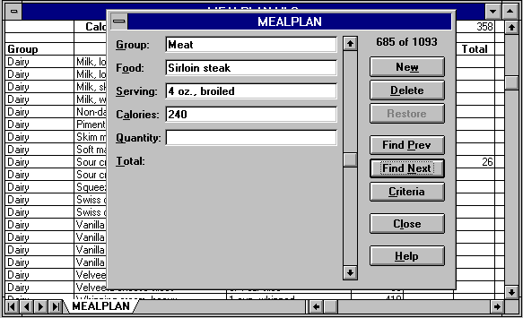 As each item is selected, the Meal total increases. If the meal exceeds the allowed calories, items can be removed by scrolling through the database or by using the DATA FORM to select items with a Quantity >0 and present them for review.