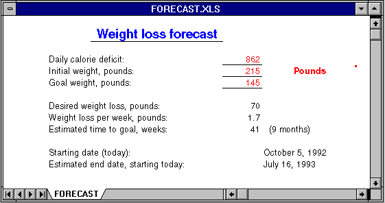 A Excel worksheet for diet planning is supplied in the file FORECAST.XLS. When you load this worksheet you're presented with the following screen: