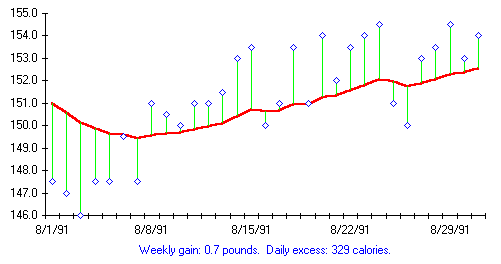Not only does the trend let you balance your calories, it's a tireless sentry that notifies you of emerging weight problems while they're still easy to correct. Suppose you just printed a trend chart like this one.
